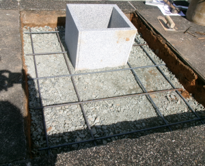 格子状に這わせた直径10mmほどの鉄筋をいれ、モルタルで基礎を作ります。