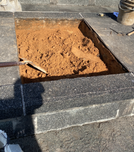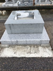 モルタルの厚みは10cm程度で、駐車場並の強度が期待できます。墓地の中央には石の骨箱が設置され、墓開きご法要の際に納骨されるご予定です。