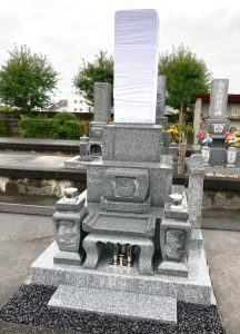 墓石小物などを設置して、墓石工事が完了致しました。墓石の一番上の石にはサラシが巻かれ、眼を閉じているという解釈になります。このサラシは『墓開き開眼法要』の時、ご住職様の指示でサラシが取られ眼を開けられます。続いて納骨、読経が執り行われます。このお客様の墓石本体はインド産高級石材で、色あせ等の変色が少なく、見た目も、高級国産墓石に似た細かな石材で高級感があります。
