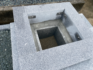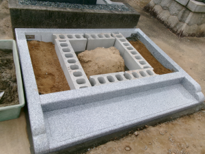 今お薦めの石枠で、全面階段型でゆったりと出入りが可能です。墓地の中央には、ご契約時に約束した「巾広のブロック基礎補強土台」を設置致しました。この土台の上に墓石本体が設置されます。