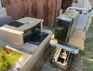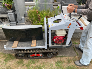 ②墓石本体の台座石の設置 続いて、墓石本体の台座石の設置の様子で、この墓石工事では、石を運ぶために移動式エンジン付運搬機を使用致しました。この運搬機で墓石の各パ-ツの石を運び設置致しました。