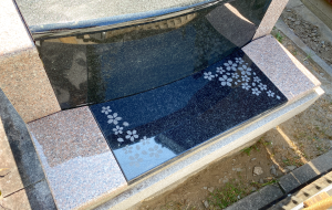 台座石の床石には桜の彫刻が彫られています。この彫刻はサンドブラスト手法で、石の表面を削った彫刻の技法で仕上げています。