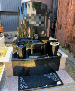 ③墓石本体の完成 続いて、墓石本体の設置と続き、花を飾る花立石、お線香を置く香炉石、水を入れる湯呑石などが置かれています。この墓石の濃い色の石材はインド産、薄いピンク色の石は中国産を使用して2種類の異なる石材でデザインされています。