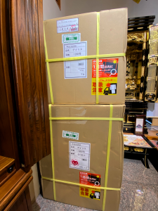 上記の写真の様に未開封のメ-カ-直送の梱包状態のもので、人が触れた指紋ついていたり、かなり古い売れ残りの在庫品可能性のある展示品ではなく、メ-カ-のラベルが貼られているダンボ-ルの未開封のメ-カ-直送品のお届けです。お客様ご自宅で、ご本様の前で出来立てのメ-カ-直送品のお仏壇の開封をさせて頂きました。