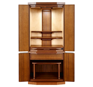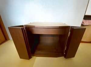 上記でご案内の国産お仏壇『アイリス1200』を、お客様のご自宅へお届けさせて頂きました。このお仏壇の特徴の1つとして、内壁をカ-リ-メイプルで仕上げた都市型お仏壇として人気があります。下台の中には、収納可能な経机が内蔵されておりコストパフォ-マンスに優れた国産お仏壇です。