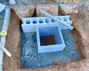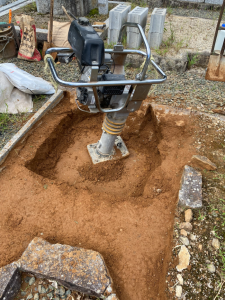 墓石工事は、墓石本体の真下に基礎補強土台を設置することから始めます。参考写真の様に、墓石本体の真下の元土を30cmほど掘下げて、ランマ-と呼ばれる地盤転圧機で、地面をしっかり固めます。ランマ-で固めないと、土自体が緩み墓石が傾く恐れがあります。続いて、転圧後の墓地に強度がある巾広ブロックを四方に設置して「基礎補強土台」が完成致しました。