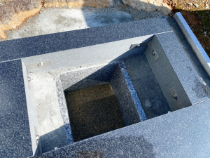墓石本体の台座石の設置工事で、耐震用のステンレス金具等を使用して、石と石との接合箇所の補強致しました。続いて墓石本体の石材の設置と花立石や香炉石や水鉢石などの小物石を設置して、このご契約墓石が完成致しました。