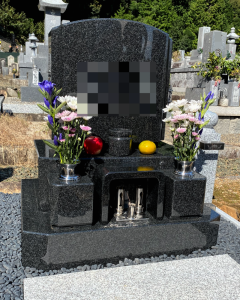 豊川市内の曹洞宗のご寺院墓地の実際の完成した最新デザイン墓石です。この墓石の石は、インド産石材を使用致しました。このインド産石の特徴は、変色色あせなどは少なく、石の見た目は,目の細かな濃いグレ-色で、品の良い趣のあるお墓です。この墓石は、デザイン墓石『未来墓シリ-ズ』で、詳細内容は右記のURLのホ-ムペ-ジでご確認できます。https://ec-miraivo.com/lineup_cat/miraivo/